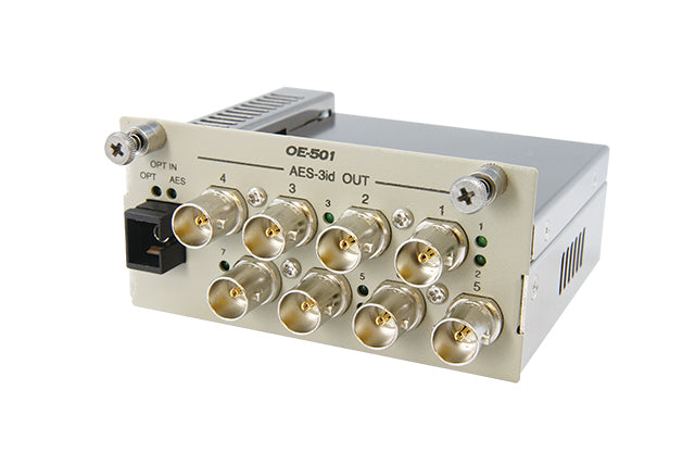 ・AES-3id光コンバータ ・最小受光電力:-26dBm ・準拠規格:AES-3id-1995 ・適合光ファイバ:シングルモード ・AESコネクタ:75ΩBNC型×8 ・光コネクタ:SC型×1 ・使用スロット数:5スロット
