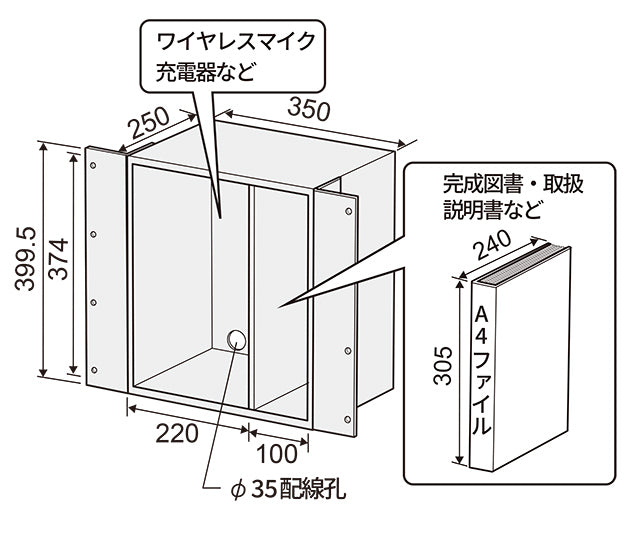 ・多目的収納ユニット ・外形 350×399.5×250 ・収納寸法 左220×374×248、右100×374×248