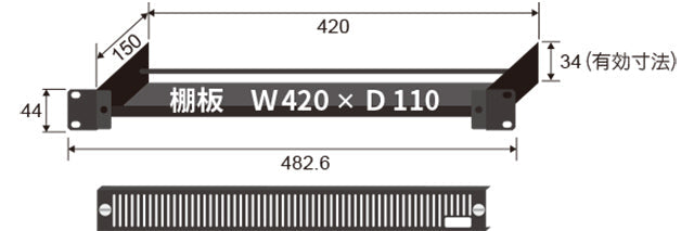 ・EIA1U浅型 ・外形 W420×H34×D150、棚板 W420×D110 ・結束バー1本付属 ・スリット入りカバーパネル(無地銘板付き)