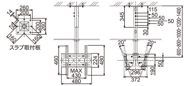 ・中型天吊ハンガー、26~50型(30㎏×2台まで) ・両面型 ・本体質量 21.3kg ・パイプセット長さ調整範囲:1400,1450,1500,1550 ・セット内容:壁掛金具、本体ベース、パイプ、スラブ取付板 ・ワンタッチロック機構